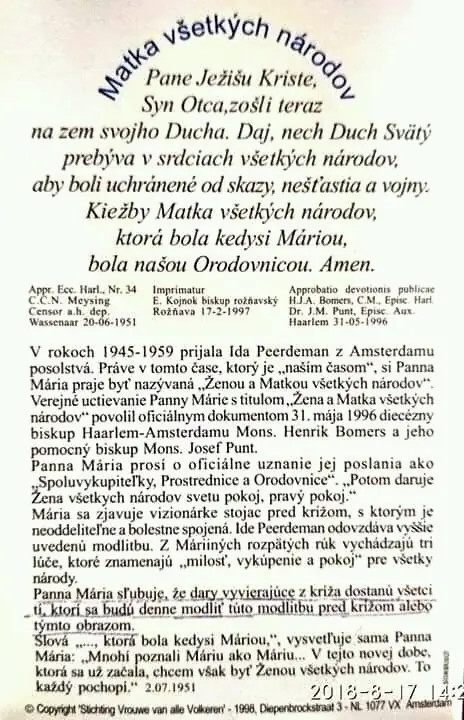 25. marca 1945 Peerdemanová oznámila, že videla vo svetle obklopenú ženu, ktorá sa identifikovala ako "dáma" a "matka".